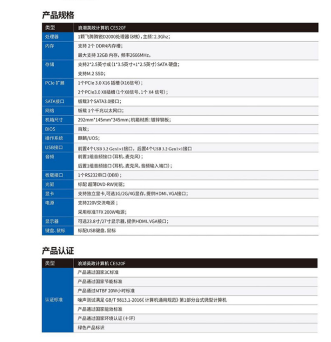 INSPUR浪潮 CE520F 1顆飛騰D2000處理器 硬盤獨(dú)立顯卡 8GB內(nèi)存256GB SATA SSD硬盤鍵鼠