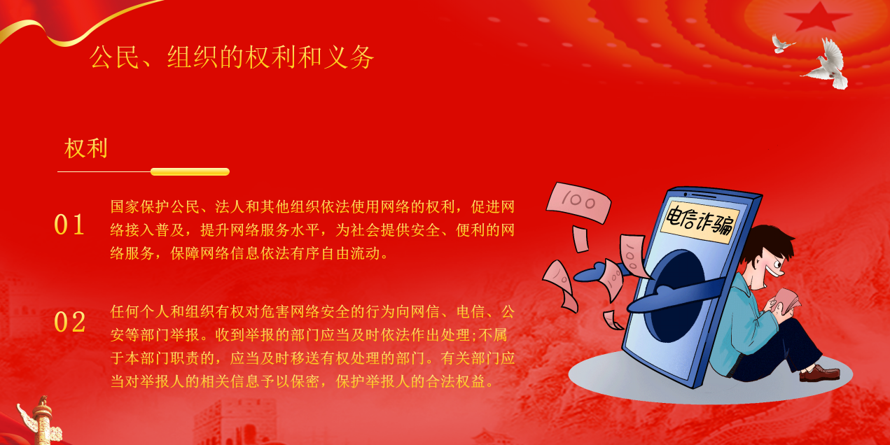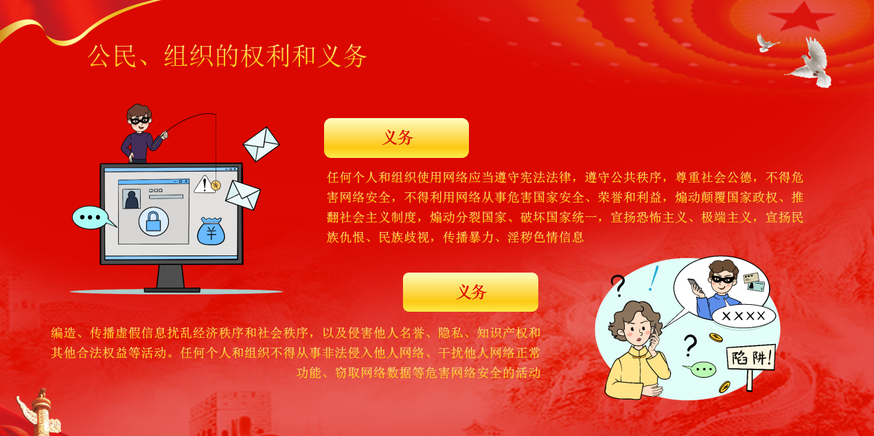 在網(wǎng)絡(luò)安全保障體系中,公民與組織依法享有的權(quán)利可分為"積極權(quán)利"與"消極權(quán)利"兩大維度,這兩類權(quán)利共同構(gòu)筑了網(wǎng)絡(luò)空間的權(quán)益保護(hù)網(wǎng)。網(wǎng)絡(luò)安全不是某一個(gè)人的事,而是我們每個(gè)人都要守護(hù)的共同責(zé)任。作為公民和組織,在網(wǎng)絡(luò)空間里該怎么做、不該怎么做,其實(shí)有著清晰的“行為指南”。我們可以把這些責(zé)任分成三個(gè)層面來記:首先是必須守住的“底線義務(wù)”,其次是絕對不能碰的“禁止行為”,最后是千萬別忽視的“協(xié)助責(zé)任”。