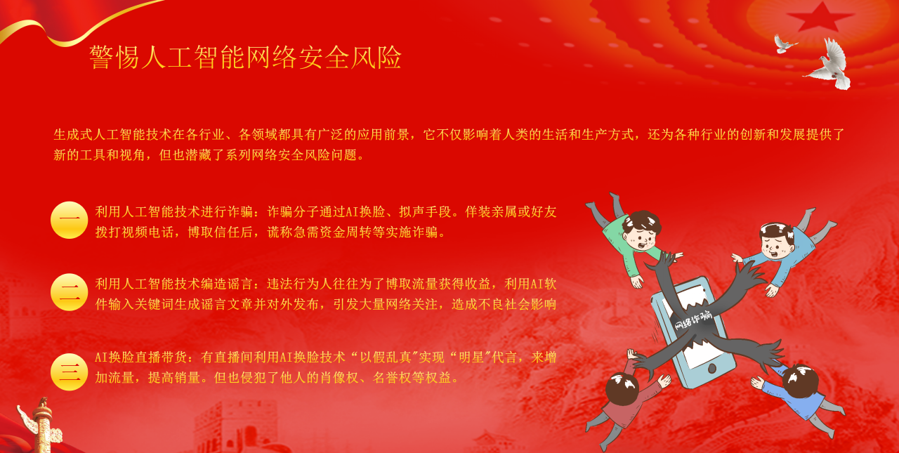 人工智能在為生活帶來便利的同時(shí),也催生了新型網(wǎng)絡(luò)安全風(fēng)險(xiǎn)。這些風(fēng)險(xiǎn)不僅威脅個(gè)人財(cái)產(chǎn)安全,還可能擾亂社會(huì)秩序、侵犯知識(shí)產(chǎn)權(quán),需要我們高度警惕。網(wǎng)絡(luò)安全不是某一個(gè)人的事,而是我們每個(gè)人的事。 當(dāng)我們看到電信詐騙案中的受害者痛哭流涕,當(dāng)企業(yè)數(shù)據(jù)泄露導(dǎo)致千萬用戶權(quán)益受損,當(dāng)關(guān)鍵信息基礎(chǔ)設(shè)施面臨潛在威脅,我們更能理解:個(gè)人的疏忽可能成為整個(gè)網(wǎng)絡(luò)的薄弱環(huán)節(jié),而每個(gè)人的警惕則能匯聚成堅(jiān)不可摧的安全力量。唯有全社會(huì)共同努力,才能筑牢這道無形的“防火墻”,織密覆蓋全民的“保護(hù)網(wǎng)”。